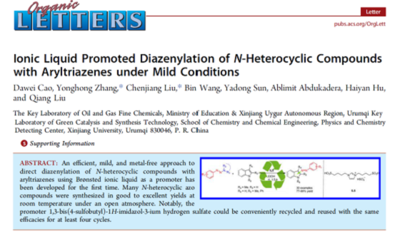 刘晨江教授和张永红团队在影响因子为6.732的期刊Organic Letter上发表了题为“Ionic liquid promoted diazenylation of N-heterocyclic compounds with aryltriazenes under mild conditions”的论文(Organic Letter, 2016, 18, 2000-2003)。