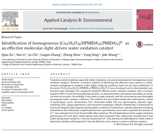 王吉德教授课题组在影响因子8.328的期刊Applied Catalysis B: Environment上发表了题为“Identification of homogeneous [Co4(H2 O)4(HPMIDA)2(PMIDA)2]6-as an effective molecular-light-driven water oxidation catalyst”的论文(Applied Catalysis B: Environmental, 2017, 202, 397-403)。