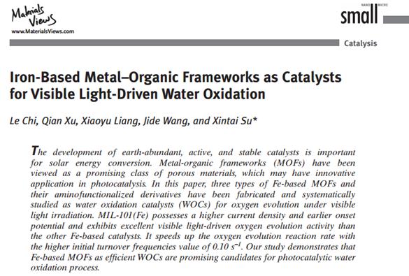 宿新泰教授课题组在影响因子为8.315的期刊Small发表了题为“Iron-Based Metal-Organic Frameworks as catalysts for Visible Light-Driven Water Oxidation”的论文(Small,2016, 12, 1351–1358)。